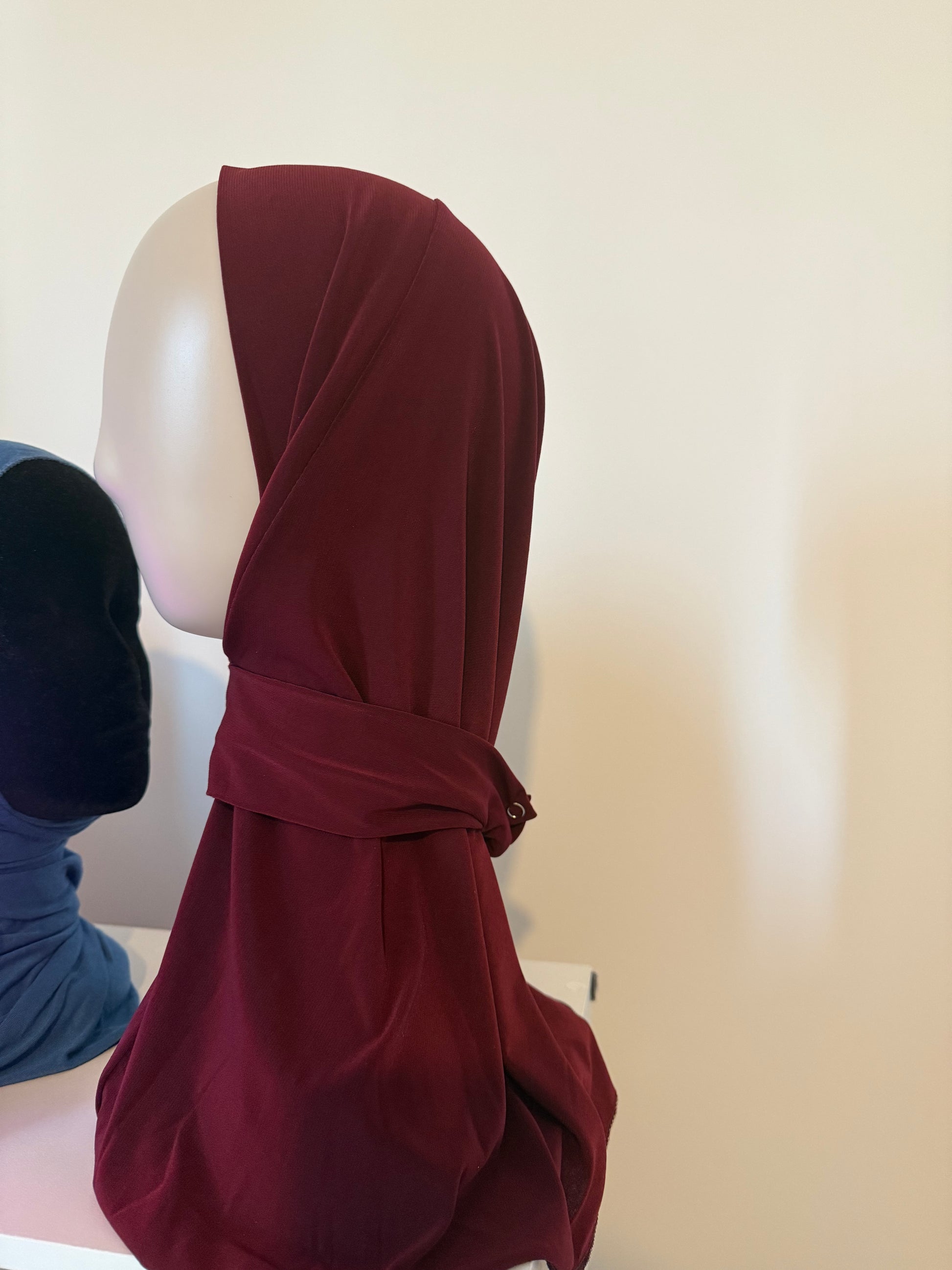 Praticité : hijab enfilé avec attache par deux boutons à l’arrière